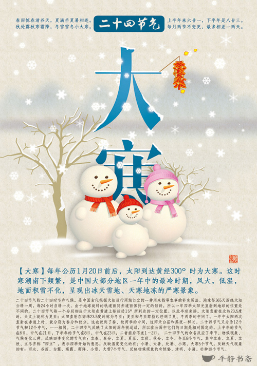 大寒是二十四节气中最后一个节气,每年1月20日前后太阳到达黄经300°时为"大寒"。大寒,是天气寒冷到极点的意思。《授时通考·天时》引《三礼义宗》:"大寒为中者,上形于小寒,故谓之大......寒气之逆极,故谓大寒。"这时寒潮南下频繁,是我国大部地区一年中的寒冷时期,风大,低温,地面积雪不化,呈现出冰天雪地、天寒地冻的严寒景象。诗云"蜡树银山炫皎光,朔风独啸静三江。老农犹喜高天雪,况有来年麦果香。(左河水)"大寒是中国二十四节气中的最后一个,过了大寒又立春,即迎来新一年的节气轮回。